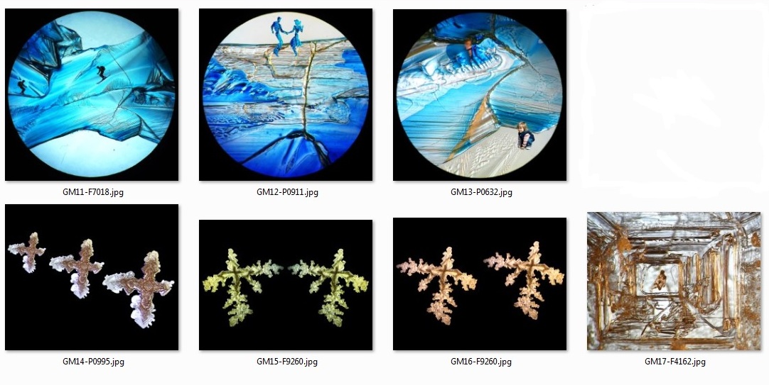 Planet Xy Landscapes with Visitors Plus Other Concoctions The wondrous landscapes of Planet Xy, the imaginary world created by Xylitol sugar crystals, were formed when I added blue food coloring to the xylitol solution. These landscapes just called for visitors, and I could not resist! I used the GIMP software to “photoshop” the figures into the landscapes. Later GIMP-Modified images include clustering of isolated crystals and other concoctions. |